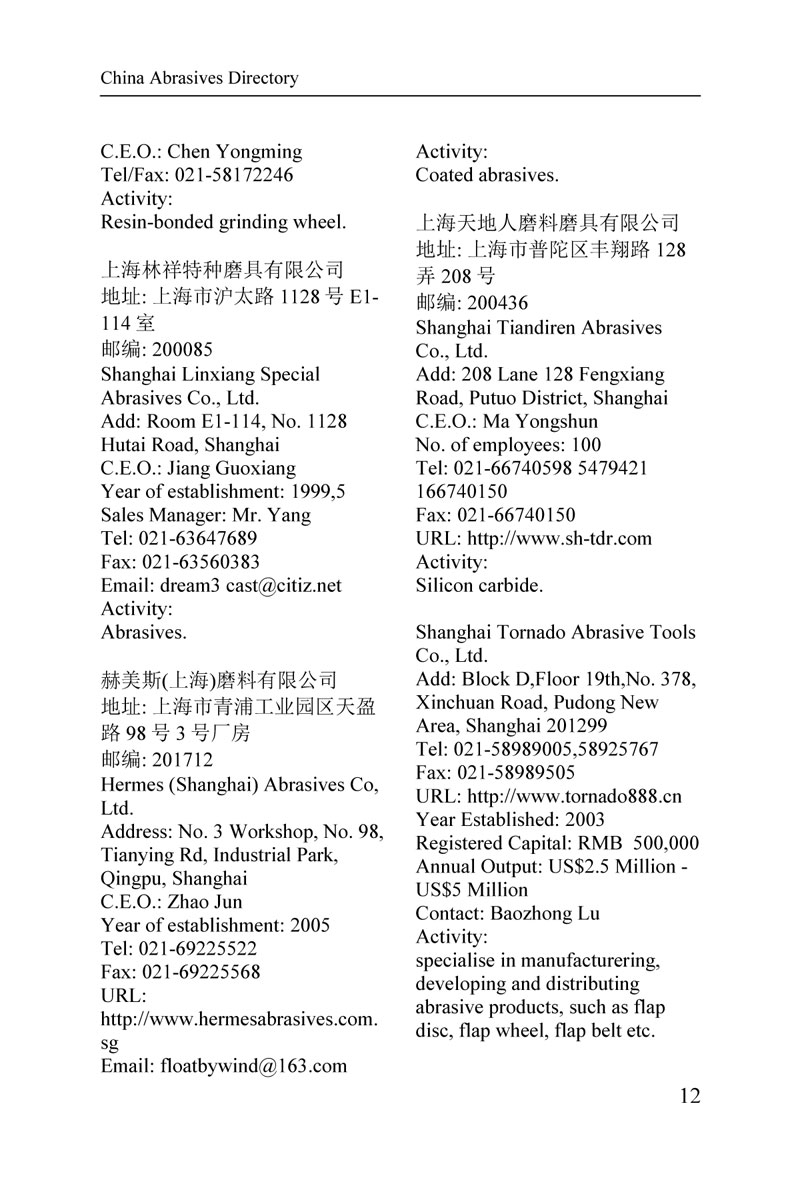 To meet a need for information, Business Data International Inc collected data and compiled the first ever English-language China Abrasives Directory in 2010. To follow the success of that directory, a 2015 edition has been greatly expanded and completely updated revising particularly details for contacts, email, and website URLs. We believe this edition is a must-have for anyone who is doing business in the Chinese abrasive industry.